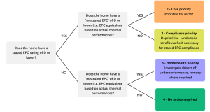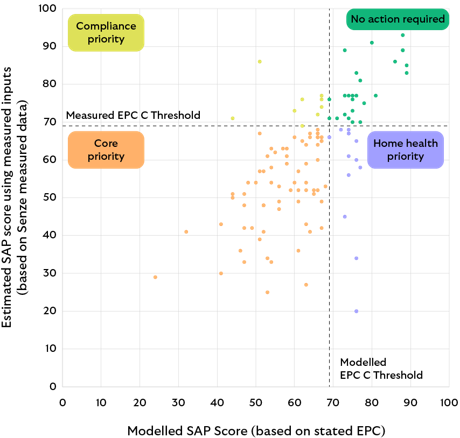 This matters because investment decisions are often based on the modelled data that underpin EPCs. By comparing measured and modelled performance, we identified clear groups that can guide smarter decision making. To make sense of the results, we grouped the homes into four categories by comparing their measured and modelled EPC ratings against the EPC C threshold, as shown below.